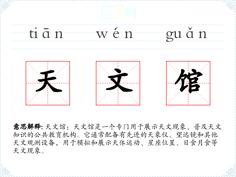 - 词源:“天文馆”一词由“天文”和“馆”组成。“天文”源自古代对天体现象的研究,“馆”指机构或场所。
