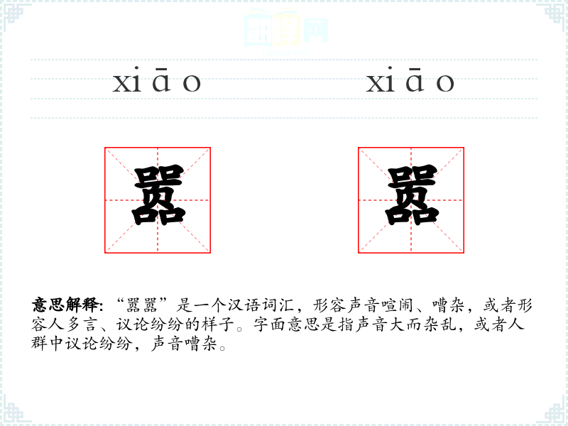“嚣嚣”一词源自古代汉语,其字形和发音在历史演变中保持相对稳定。在古代文献中已有使用,如《左传》等,描述战场或市场的嘈杂声。
