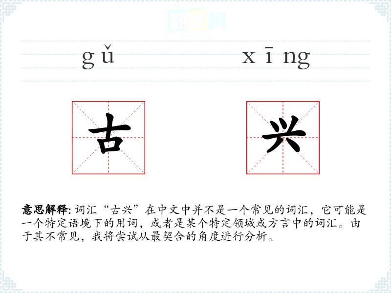 词汇“古兴”在中文中并不是一个常见的词汇,它可能是一个特定语境下的用词,或者是某个特定领域或方言中的词汇。由于其不常见,我将尝试从最契合的角度进行分析。