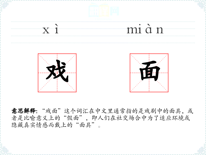 “戏面”这个词汇在中文里通常指的是戏剧中的面具,或者是比喻意义上的“假面”,即人们在社交场合中为了适应环境或隐藏真实情感而戴上的“面具”。