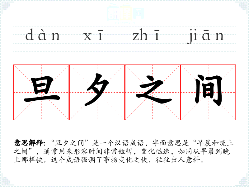 “旦夕之间”是一个汉语成语,字面意思是“早晨和晚上之间”,通常用来形容时间非常短暂,变化迅速,如同从早晨到晚上那样快。这个成语强调了事物变化之快,往往出人意料。