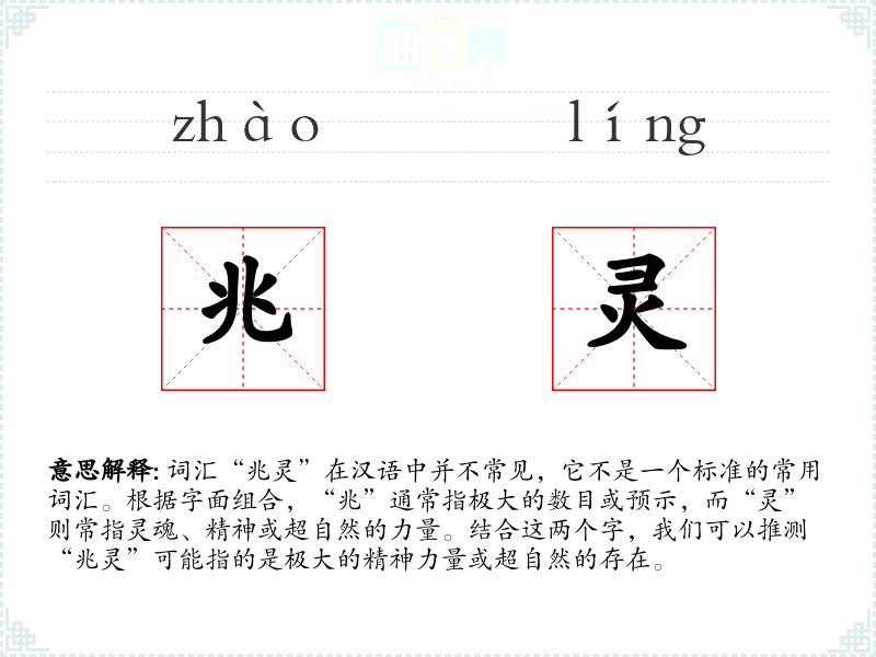 由于“兆灵”不是一个常用词汇,其词源和演变不详。可能是由“兆”和“灵”两个字组合而成,用于特定语境下的创造性表达。