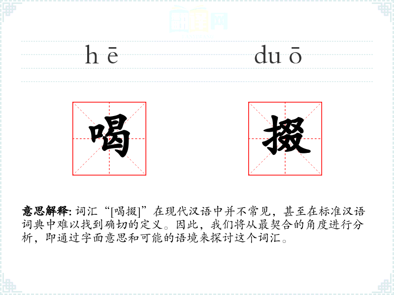 词汇“[喝掇]”在现代汉语中并不常见,甚至在标准汉语词典中难以找到确切的定义。因此,我们将从最契合的角度进行分析,即通过字面意思和可能的语境来探讨这个词汇。