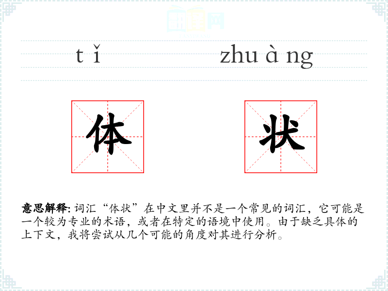 “体状”字面意思可能指的是物体的形状或状态,尤其是在描述物体的外形或结构时使用。它可能与“形态”、“形状”等词汇有相似的含义。