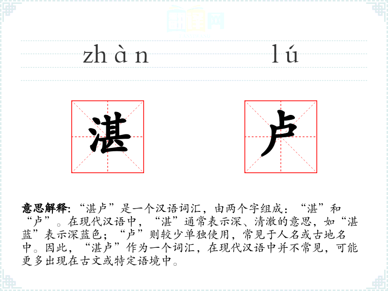 “湛卢”是一个汉语词汇,由两个字组成:“湛”和“卢”。在现代汉语中,“湛”通常表示深、清澈的意思,如“湛蓝”表示深蓝色;“卢”则较少单独使用,常见于人名或古地名中。因此,“湛卢”作为一个词汇,在现代汉语中并不常见,可能更多出现在古文或特定语境中。