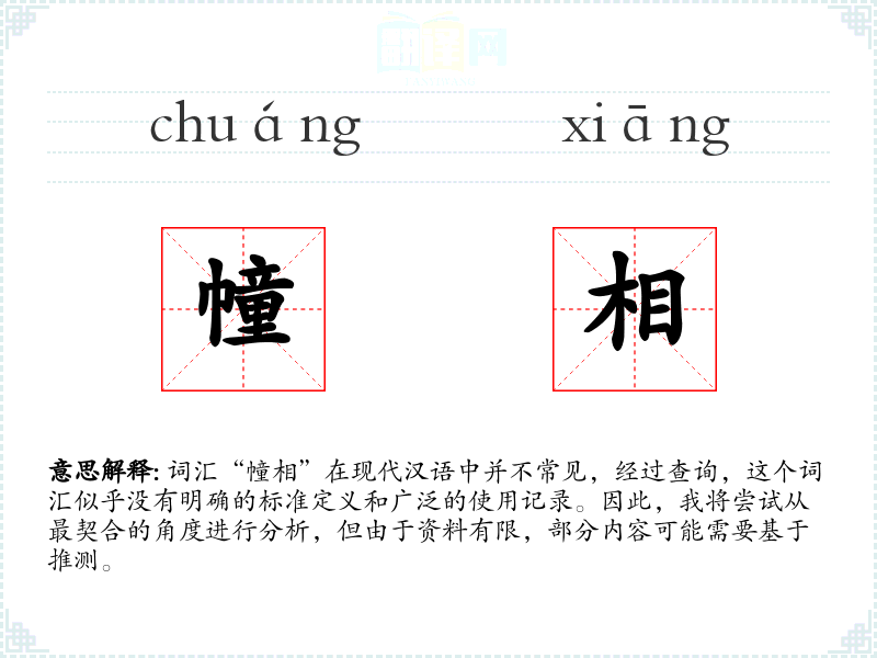 由于“幢相”在现代汉语中不常见,没有确切的标准定义。从字面上看,“幢”通常指建筑物,如楼房、塔等,而“相”可以有多种含义,如相貌、相互、相位等。结合来看,“幢相”可能指的是建筑物的外观或形态。