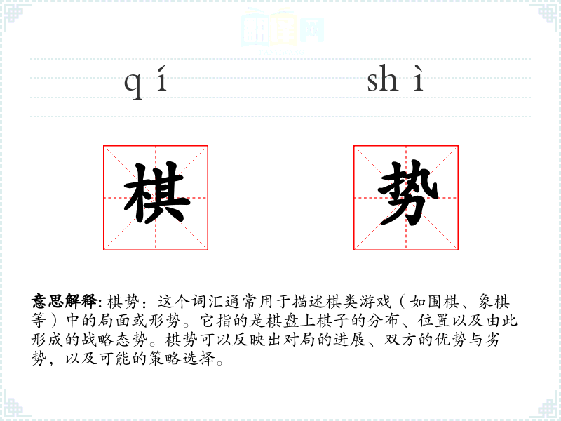 棋势:这个词汇通常用于描述棋类游戏(如围棋、象棋等)中的局面或形势。它指的是棋盘上棋子的分布、位置以及由此形成的战略态势。棋势可以反映出对局的进展、双方的优势与劣势,以及可能的策略选择。