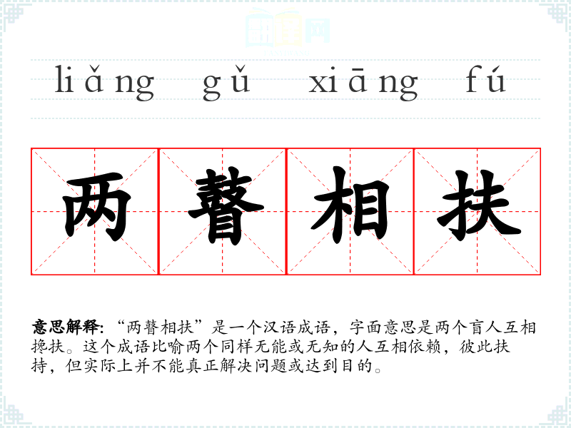 “两瞽相扶”是一个汉语成语,字面意思是两个盲人互相搀扶。这个成语比喻两个同样无能或无知的人互相依赖,彼此扶持,但实际上并不能真正解决问题或达到目的。