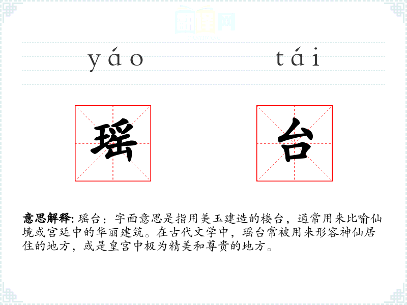 瑶台:字面意思是指用美玉建造的楼台,通常用来比喻仙境或宫廷中的华丽建筑。在古代文学中,瑶台常被用来形容神仙居住的地方,或是皇宫中极为精美和尊贵的地方。