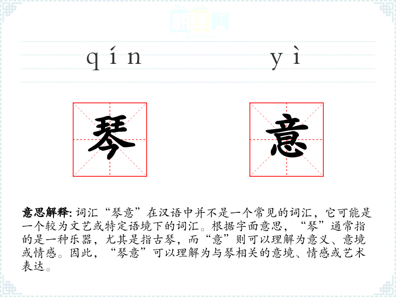- 词源:“琴”源自古代的乐器名称,“意”则是一个常用的汉语词汇,表示意义或情感。