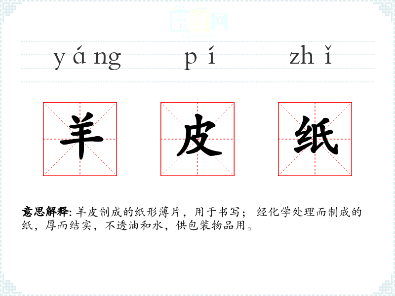 羊皮制成的纸形薄片,用于书写; 经化学处理而制成的纸,厚而结实,不透油和水,供包装物品用。