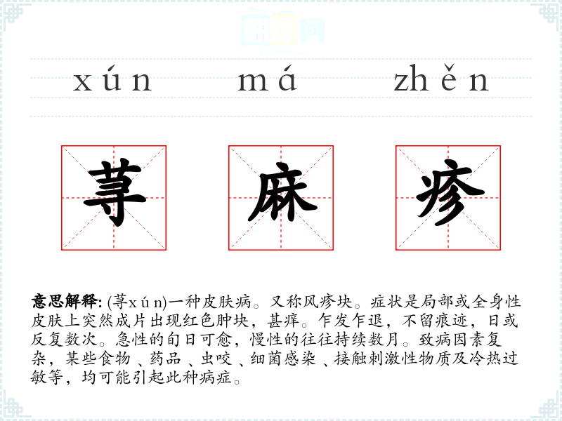 1.(荨xún)一种皮肤病。又称风疹块。症状是局部或全身性皮肤上突然成片出现红色肿块,甚痒。乍发乍退,不留痕迹,日或反复数次。急性的旬日可愈,慢性的往往持续数月。致病因素复杂,某些食物﹑药品﹑虫咬﹑细菌感染﹑接触刺激性物质及冷热过敏等,均可能引起此种病症。