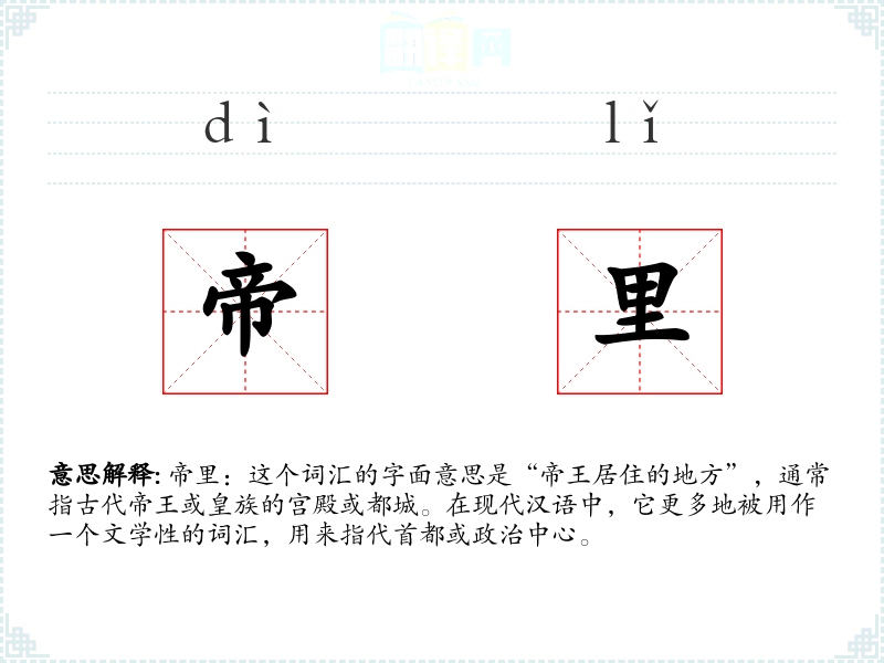 帝里:这个词汇的字面意思是“帝王居住的地方”,通常指古代帝王或皇族的宫殿或都城。在现代汉语中,它更多地被用作一个文学性的词汇,用来指代首都或政治中心。