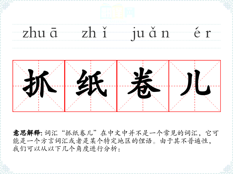 词汇“抓纸卷儿”在中文中并不是一个常见的词汇,它可能是一个方言词汇或者是某个特定地区的俚语。由于其不普遍性,我们可以从以下几个角度进行分析: