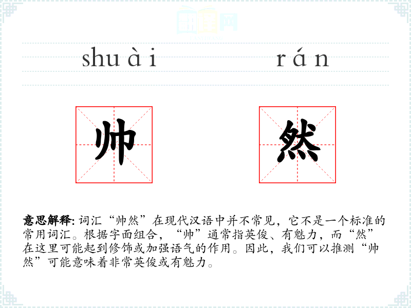 词汇“帅然”在现代汉语中并不常见,它不是一个标准的常用词汇。根据字面组合,“帅”通常指英俊、有魅力,而“然”在这里可能起到修饰或加强语气的作用。因此,我们可以推测“帅然”可能意味着非常英俊或有魅力。