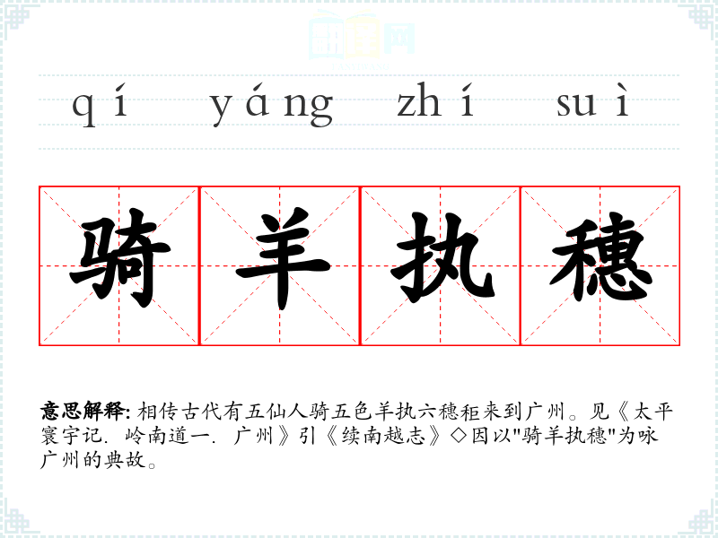 相传古代有五仙人骑五色羊执六穗秬来到广州。见《太平寰宇记.岭南道一.广州》引《续南越志》◇因以"骑羊执穗"为咏广州的典故。