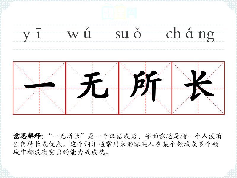 “一无所长”是一个汉语成语,字面意思是指一个人没有任何特长或优点。这个词汇通常用来形容某人在某个领域或多个领域中都没有突出的能力或成就。