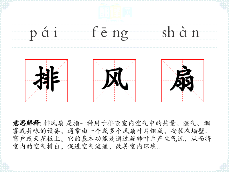 排风扇 这个词由“排”和“风扇”两个字组成。“排”字在这里表示排除或排出,而“风扇”则是指产生风力的设备。这个词在现代汉语中广泛使用,特别是在描述通风设备时。