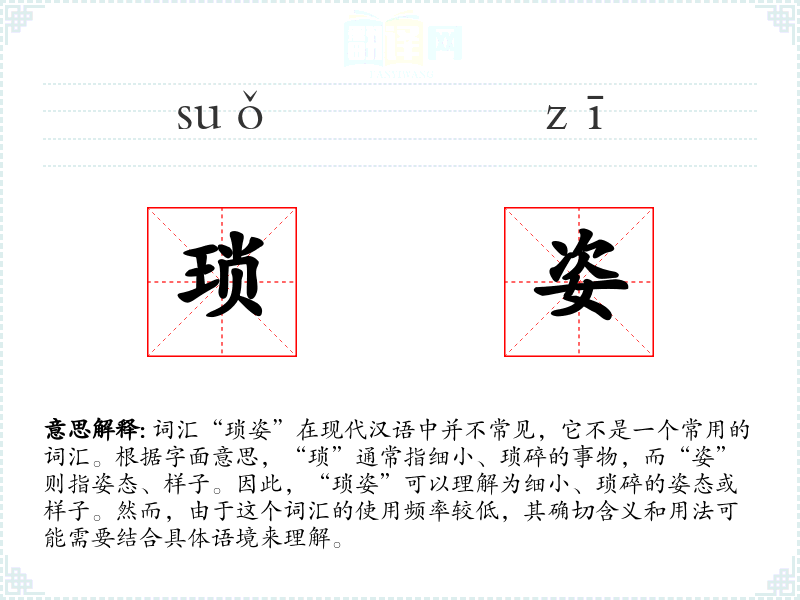 “琐姿”是一个不太常用的词汇,其含义和用法需要结合具体语境来理解。在语言学习和表达中,了解这样的词汇可以帮助更准确地表达特定的情感或描述。