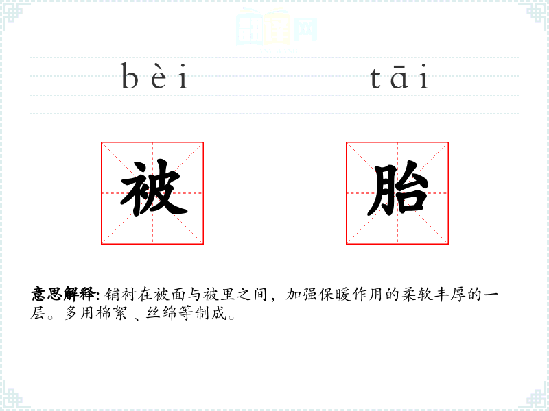 铺衬在被面与被里之间,加强保暖作用的柔软丰厚的一层。多用棉絮﹑丝绵等制成。