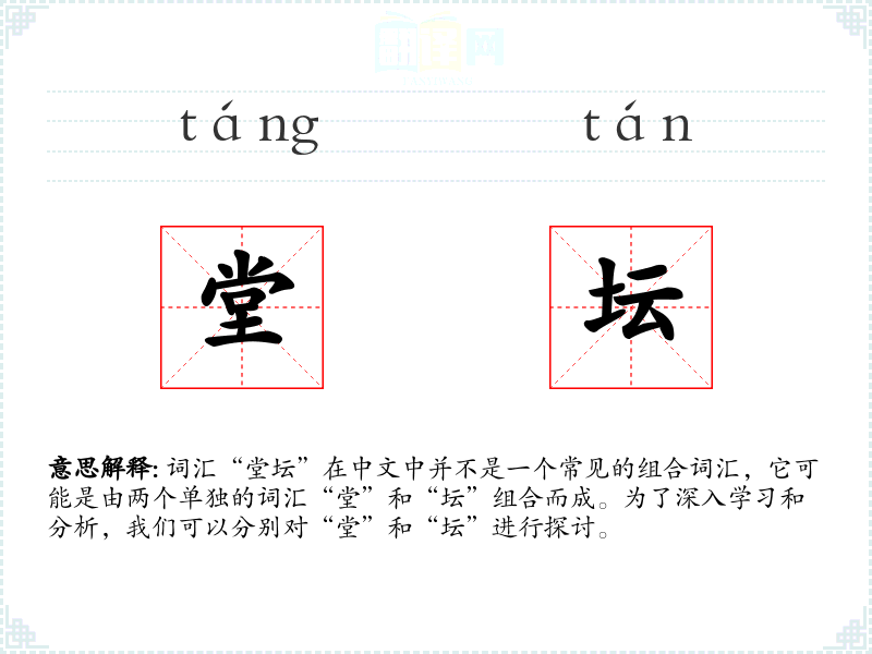 词汇“堂坛”在中文中并不是一个常见的组合词汇,它可能是由两个单独的词汇“堂”和“坛”组合而成。为了深入学*和分析,我们可以分别对“堂”和“坛”进行探讨。