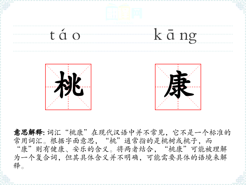 由于“桃康”不是一个标准词汇,我们无法给出一个确切的基本定义。它可能是某个特定领域或方言中的词汇,或者是某个特定文化背景下的用语。