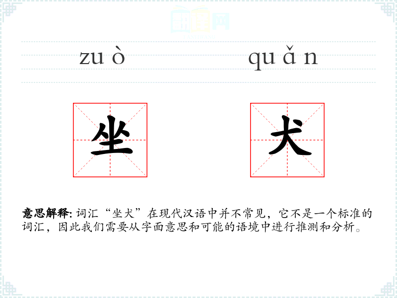 “坐犬”字面意思可能是指“坐着或蹲着的狗”。然而,这个词汇在标准汉语中并不常用,可能是一个特定领域的术语,或者是某个方言中的词汇。