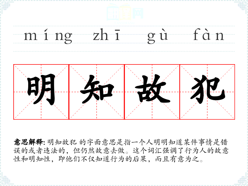明知故犯 的字面意思是指一个人明明知道某件事情是错误的或者违法的,但仍然故意去做。这个词汇强调了行为人的故意性和明知性,即他们不仅知道行为的后果,而且有意为之。