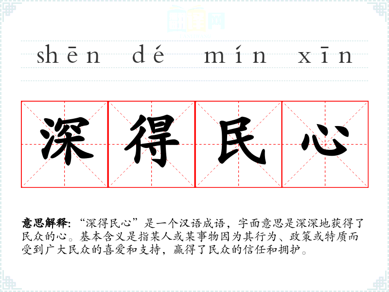 “深得民心”是一个汉语成语,字面意思是深深地获得了民众的心。基本含义是指某人或某事物因为其行为、政策或特质而受到广大民众的喜爱和支持,赢得了民众的信任和拥护。
