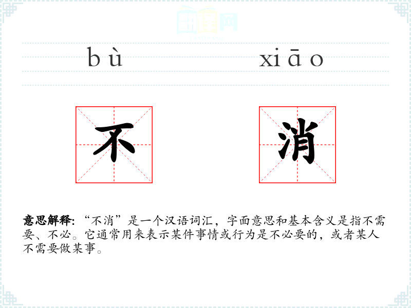 “不消”是一个汉语词汇,字面意思和基本含义是指不需要、不必。它通常用来表示某件事情或行为是不必要的,或者某人不需要做某事。