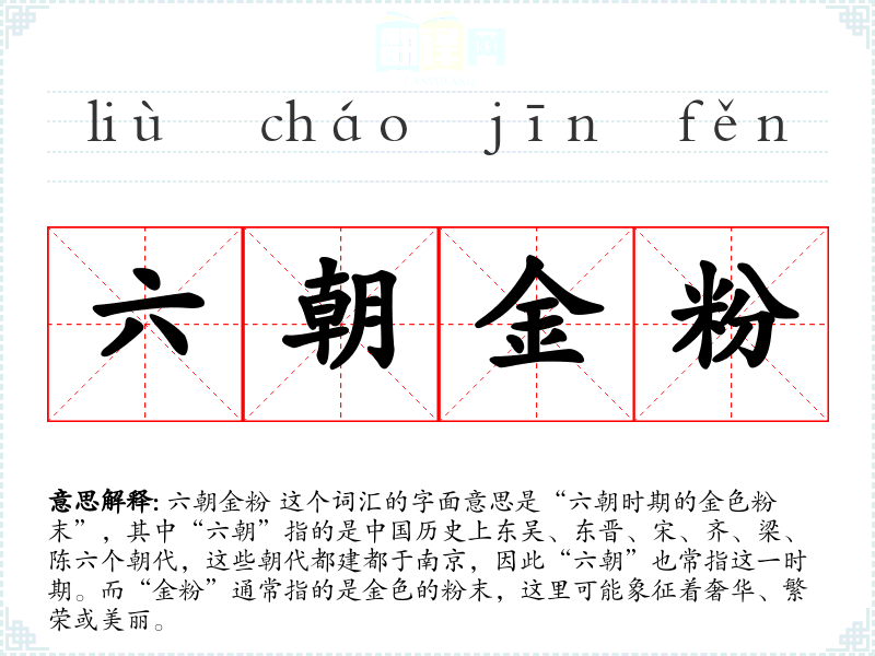 六朝金粉 这个词汇的字面意思是“六朝时期的金色粉末”,其中“六朝”指的是**历史上东吴、东晋、宋、齐、梁、陈六个朝代,这些朝代都建都于南京,因此“六朝”也常指这一时期。而“金粉”通常指的是金色的粉末,这里可能象征着奢华、繁荣或美丽。