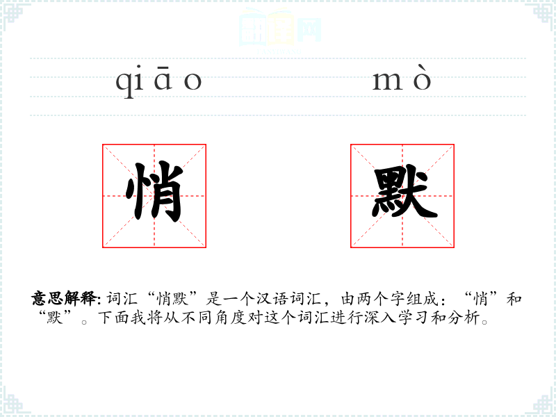 词汇“悄默”是一个汉语词汇,由两个字组成:“悄”和“默”。下面我将从不同角度对这个词汇进行深入学*和分析。