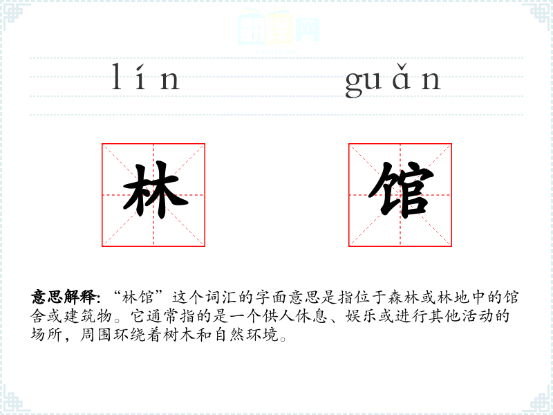 “林馆”这个词汇的字面意思是指位于森林或林地中的馆舍或建筑物。它通常指的是一个供人休息、娱乐或进行其他活动的场所,周围环绕着树木和自然环境。