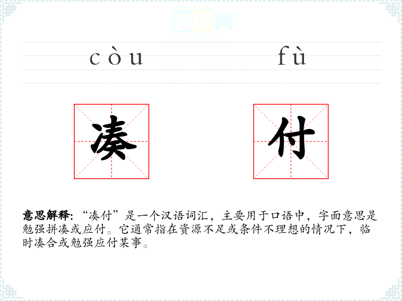 - 文学语境:在文学作品中,“凑付”可能用来描述人物在困境中的临时应对措施,增加情节的真实感和紧迫感。