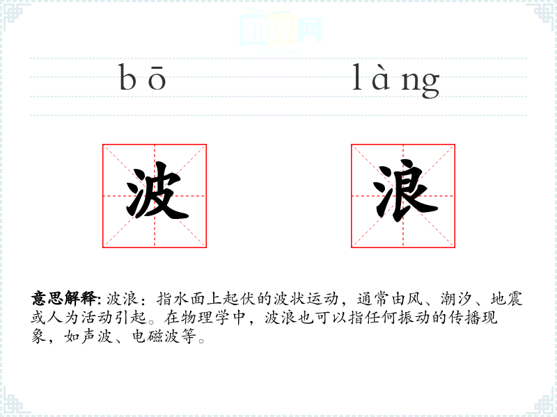 - 词源:波浪一词源自古代汉语,最初用于描述水面的波状**。随着语言的发展,其含义扩展到其他类型的波动现象。