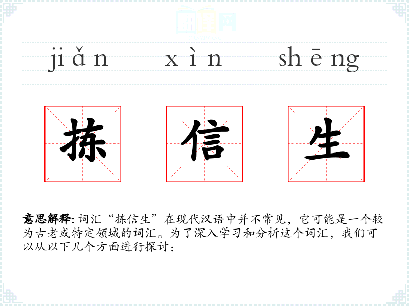 词汇“拣信生”在现代汉语中并不常见,它可能是一个较为古老或特定领域的词汇。为了深入学习和分析这个词汇,我们可以从以下几个方面进行探讨: