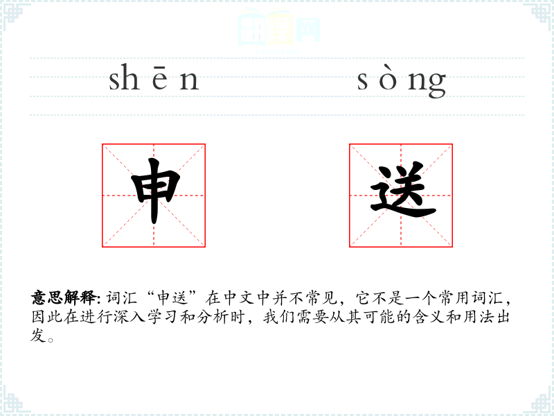 词汇“申送”在中文中并不常见,它不是一个常用词汇,因此在进行深入学习和分析时,我们需要从其可能的含义和用法出发。