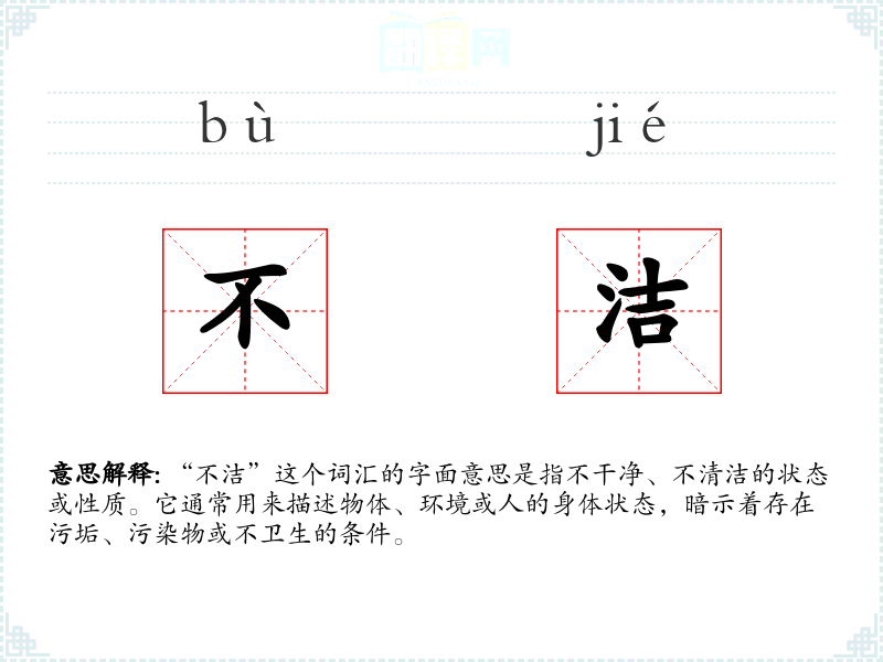 “不洁”由“不”和“洁”两个字组成,其中“不”表示否定,“洁”表示干净。这个词汇在中文中的使用历史悠久,基本含义没有太大变化。