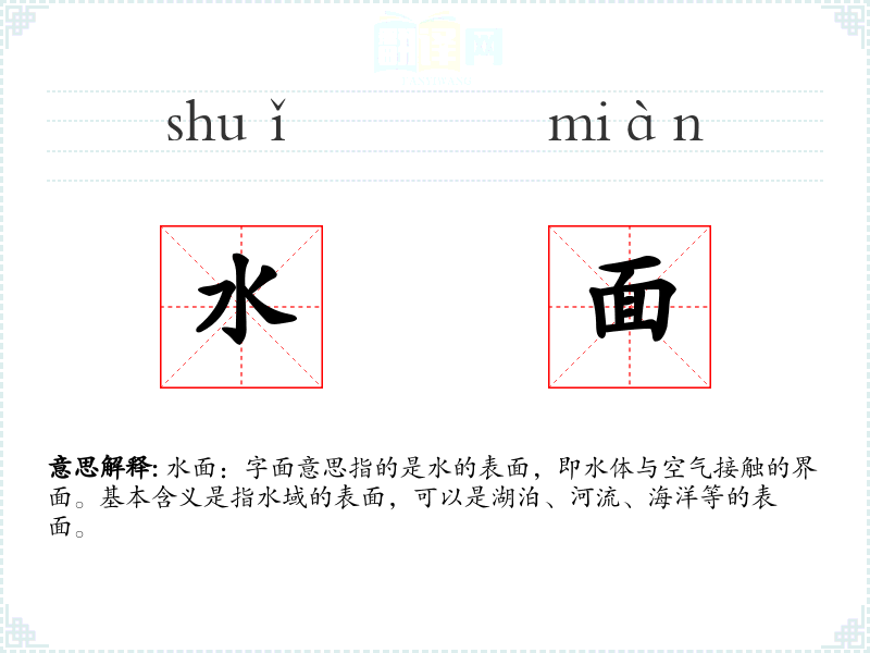 水面:字面意思指的是水的表面,即水体与空气接触的界面。基本含义是指水域的表面,可以是湖泊、河流、海洋等的表面。