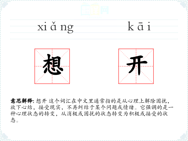 想开 这个词汇在中文里通常指的是从心理上解除困扰,放下心结,接受现实,不再纠结于某个问题或情绪。它强调的是一种心理状态的转变,从消极或困扰的状态转变为积极或接受的状态。