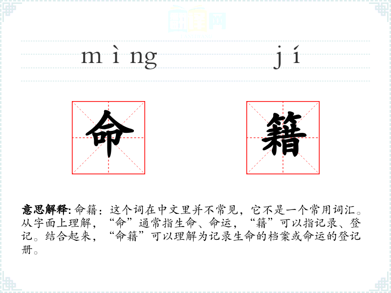 命籍:这个词在中文里并不常见,它不是一个常用词汇。从字面上理解,“命”通常指生命、命运,“籍”可以指记录、登记。结合起来,“命籍”可以理解为记录生命的档案或命运的登记册。