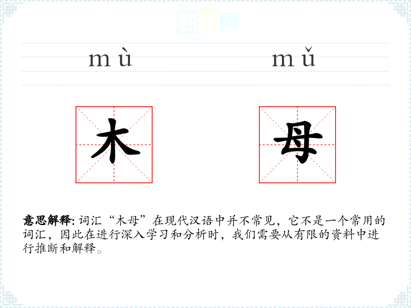 词汇“木母”在现代汉语中并不常见,它不是一个常用的词汇,因此在进行深入学*和分析时,我们需要从有限的资料中进行推断和解释。
