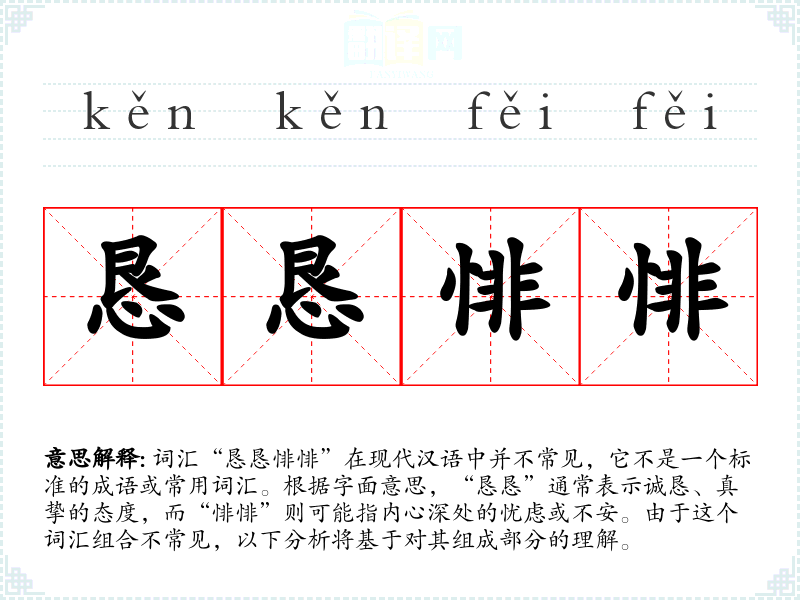 词汇“恳恳悱悱”在现代汉语中并不常见,它不是一个标准的成语或常用词汇。根据字面意思,“恳恳”通常表示诚恳、真挚的态度,而“悱悱”则可能指内心深处的忧虑或不安。由于这个词汇组合不常见,以下分析将基于对其组成部分的理解。