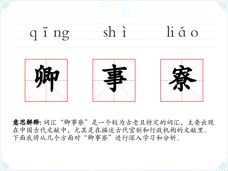 词汇“卿事寮”是一个较为古老且特定的词汇,主要出现在*古代文献中,尤其是在描述古代官制和行政机构的文献里。下面我将从几个方面对“卿事寮”进行深入学和分析。