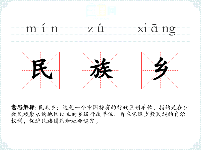 同义词:民族自治乡、少数民族乡 反义词:普通乡、乡(这些词汇并不常见,因为的行政区划通常不以民族为划分标准)