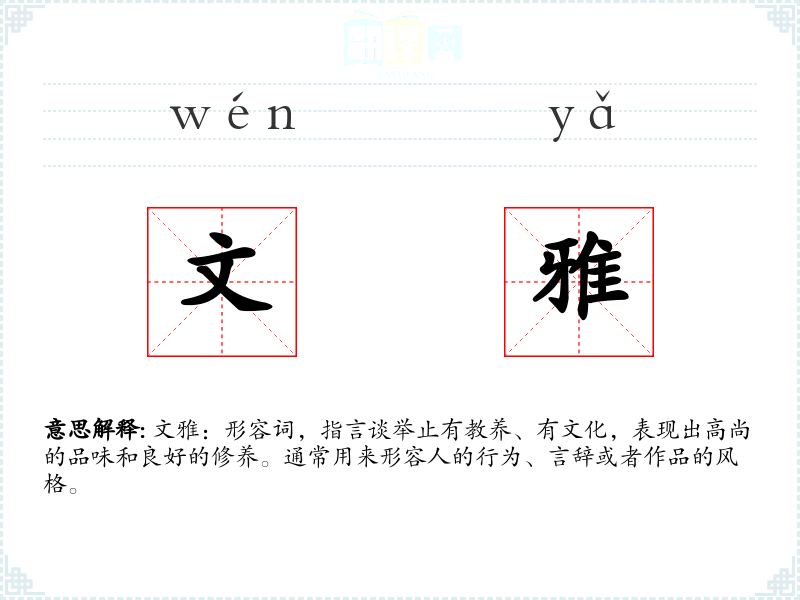 文雅:形容词,指言谈举止有教养、有文化,表现出高尚的品味和良好的修养。通常用来形容人的行为、言辞或者作品的风格。