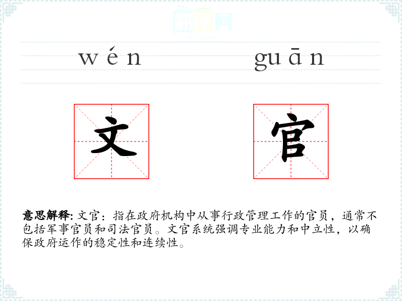 文官:指在政府机构中从事行政管理工作的官员,通常不包括军事官员和司法官员。文官系统强调专业能力和中立性,以确保政府运作的稳定性和连续性。