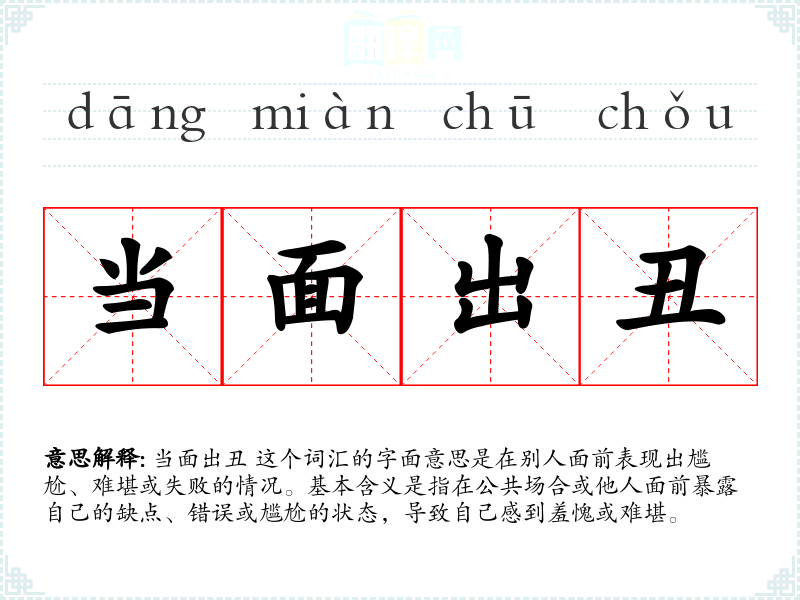 当面出丑 这个词汇的字面意思是在别人面前表现出尴尬、难堪或失败的情况。基本含义是指在公共场合或他人面前暴露自己的缺点、错误或尴尬的状态,导致自己感到羞愧或难堪。