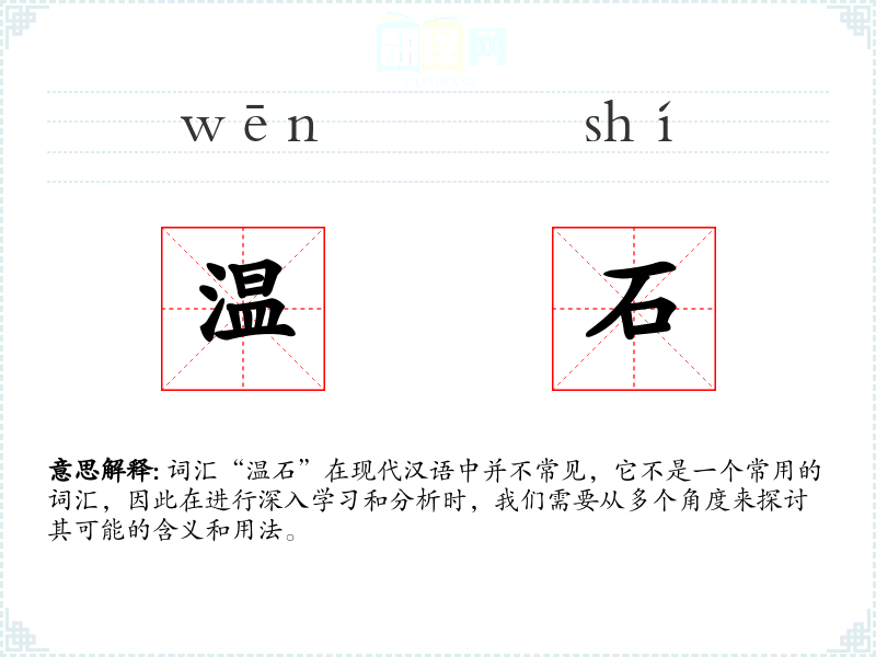 词汇“温石”在现代汉语中并不常见,它不是一个常用的词汇,因此在进行深入学*和分析时,我们需要从多个角度来探讨其可能的含义和用法。
