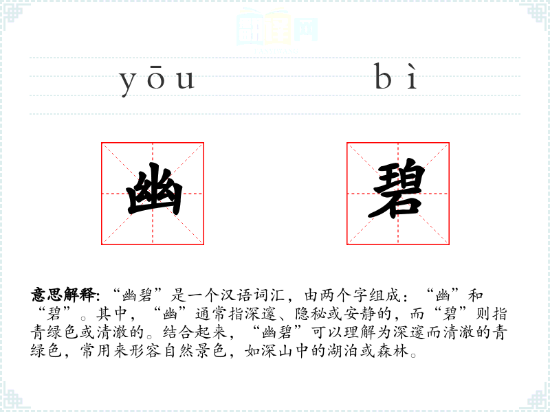 - 细微差别:这些词汇都描述了绿色,但“幽碧”更强调深邃和清澈的感觉。